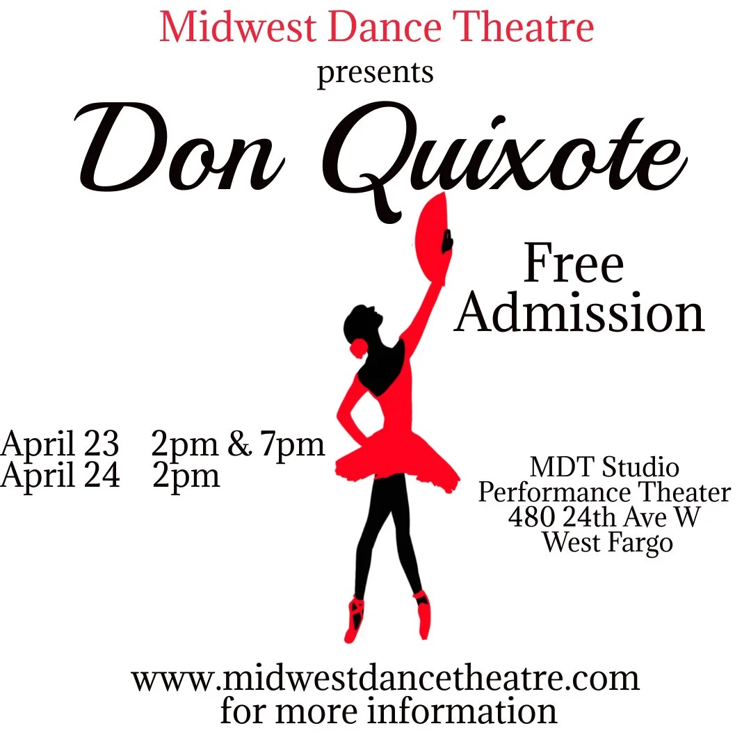 Midwest Dance Theatre presents Don Quixote! This family friendly production showcases classical dancing at its most exquisite! Join us in our Studio Performance Venue for this fun and entertaining hour-long performance! Stay after the show to meet Kitri, Basilio and all the delightful characters in this Spanish inspired ballet!