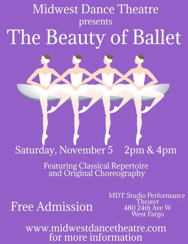 Midwest Dance Theatre presents The Beauty of Ballet! This unique and family friendly performance will introduce you to the world of ballet! To help celebrate World Ballet Day 2022, you will learn how ballet dancers train and watch them perform excerpts from the classical repertoire, along with original choreography.